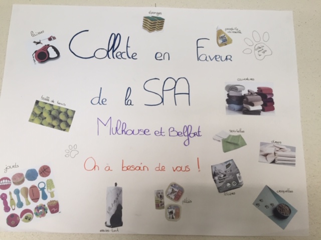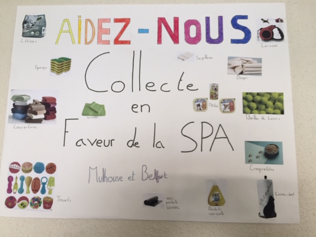 Courant mars, les collégiens ont pu participer à une collecte d’envergure au profit des SPA de Mulhouse et Belfort organisée par les élèves en Bac pro commerce du lycée d’Altkirch et relayée au collège par Mmes Higelin et Muller. La classe de 3 C s’est associée au projet en fabriquant des affiches pour donner de la visibilité au projet. La collecte s’est terminée ces derniers jours avec plus de 5000 dons dans divers établissements , magasins du secteur. Nous vous remercions pour votre générosité au profit des animaux.